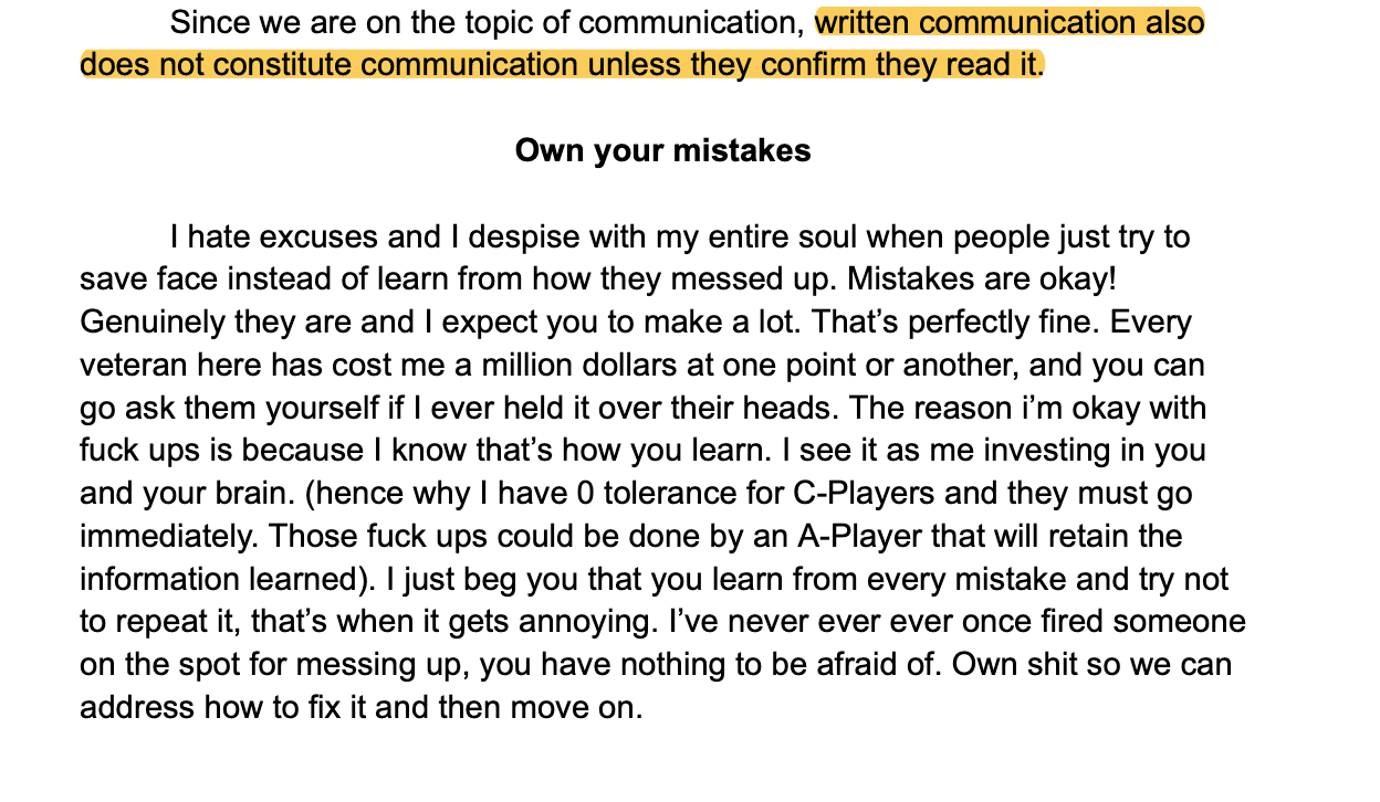 You’re going to screw up. A lot. And that’s fine—once. The only thing that’ll get you in trouble is not learning from your mistakes. Everyone here has made a million-dollar mistake at least once, but they learned and got better. If you’re not getting better and you keep screwing up the same things? Well, there’s the door. This is all about progress—if you’re not obsessed with leveling up, you’ll get left behind.