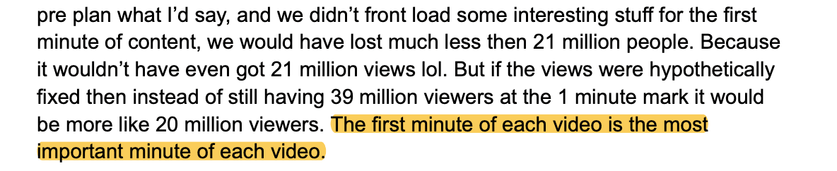 Speed is critical, especially in the YouTube world. Being able to bang out videos quickly is a key component here. He obsesses over the minutes!