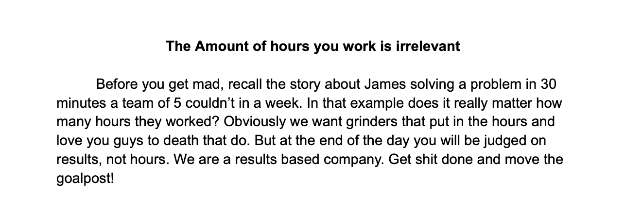 Here’s the deal: you can pull all-nighters and work 20-hour days, but if your results don’t show it, who cares? You’ll be judged by what you deliver, not by how many hours you grind. This place is for A-players, not clock-watchers. If you’re just here to collect a paycheck and skate by, guess what? You’ll be shown the exit. MrBeast wants obsessives, not clock-punchers.