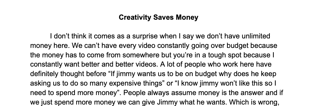 Most of us don't have a fraction of the budget that Mr. Beast has, but we can still put together some very great content bc of our creativity skills. He gives a really good example of how to create videos with what you are given (no babies were harmed during his examples).